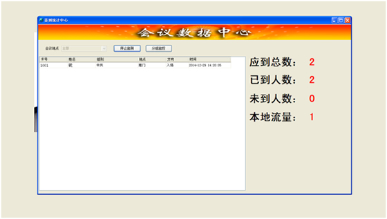 显示刷卡人信息,下面有统计信息。应道是实际参会人数,已到是刷卡进门的人数,未到人数是应道减已到人数。如果从里面往外出来人,就会已到减少未到人数增加。