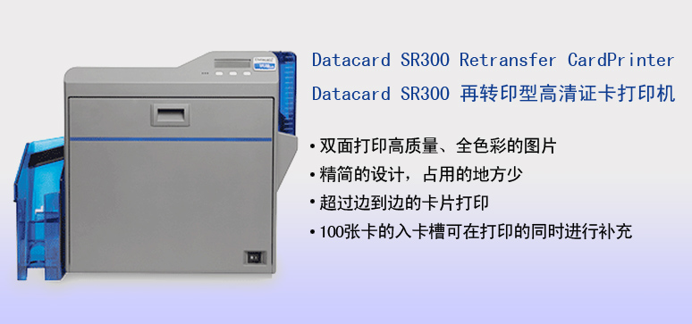 Datacard® SR300再转印卡片打印机可以使费用紧张的用户以经济的方式生产高质量、全色彩、双面卡片。它可以在多种材质的卡片上、采用超过边到边的方式打印,同时它还可以选配覆膜机。